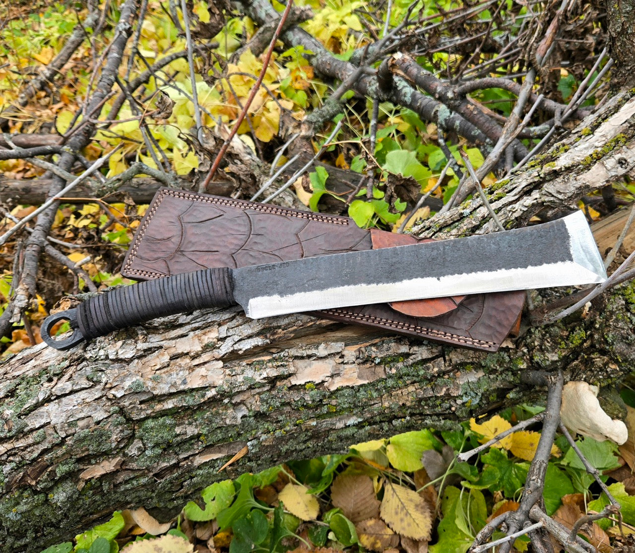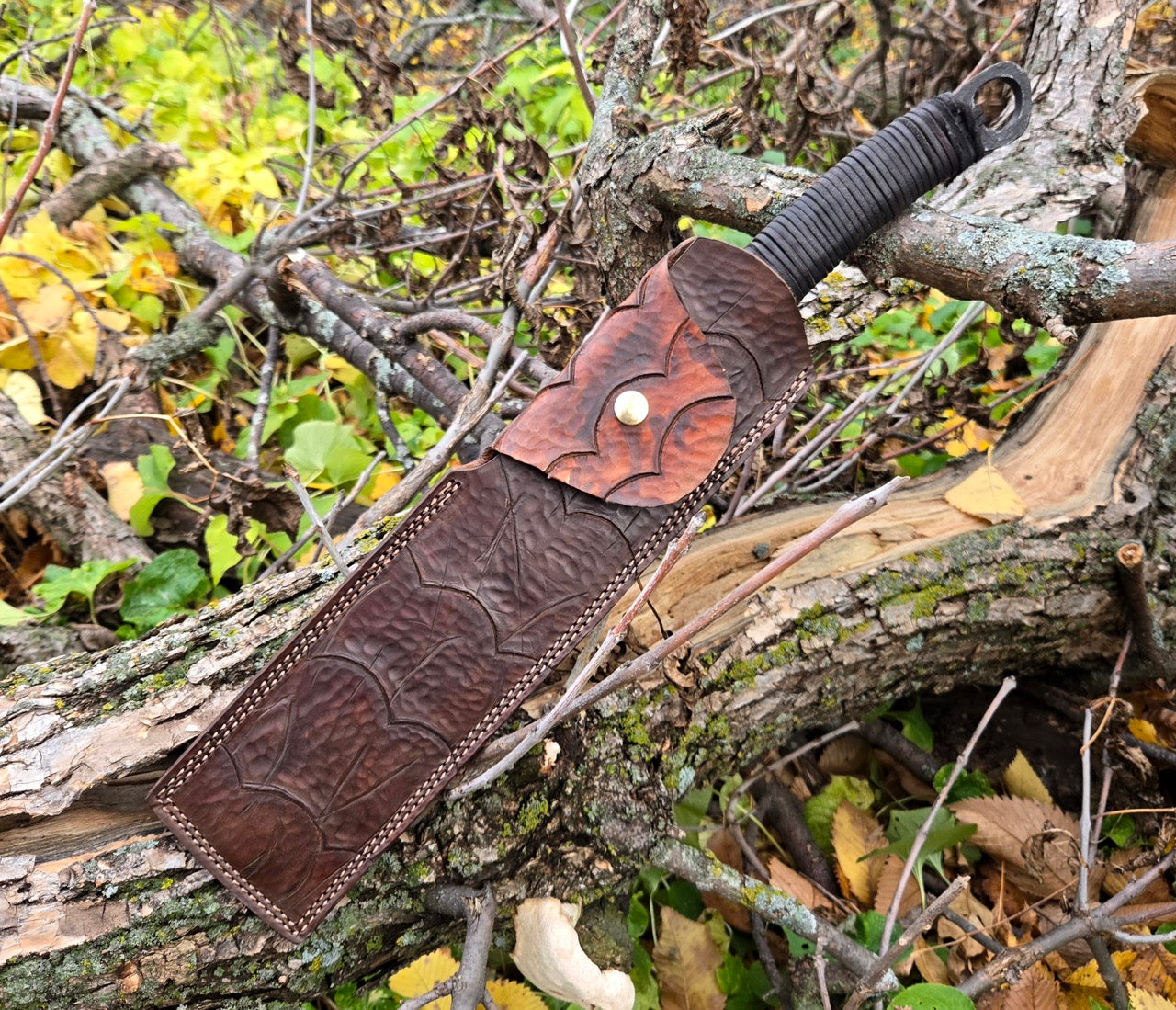 Forged from a '71 Nova leaf spring, the blade is a little 11.5". The leather-wrapped handle gives an overall length of almost 18". This beast is a little blade heavy, but it feels pretty damn nice and is very fun to swing.